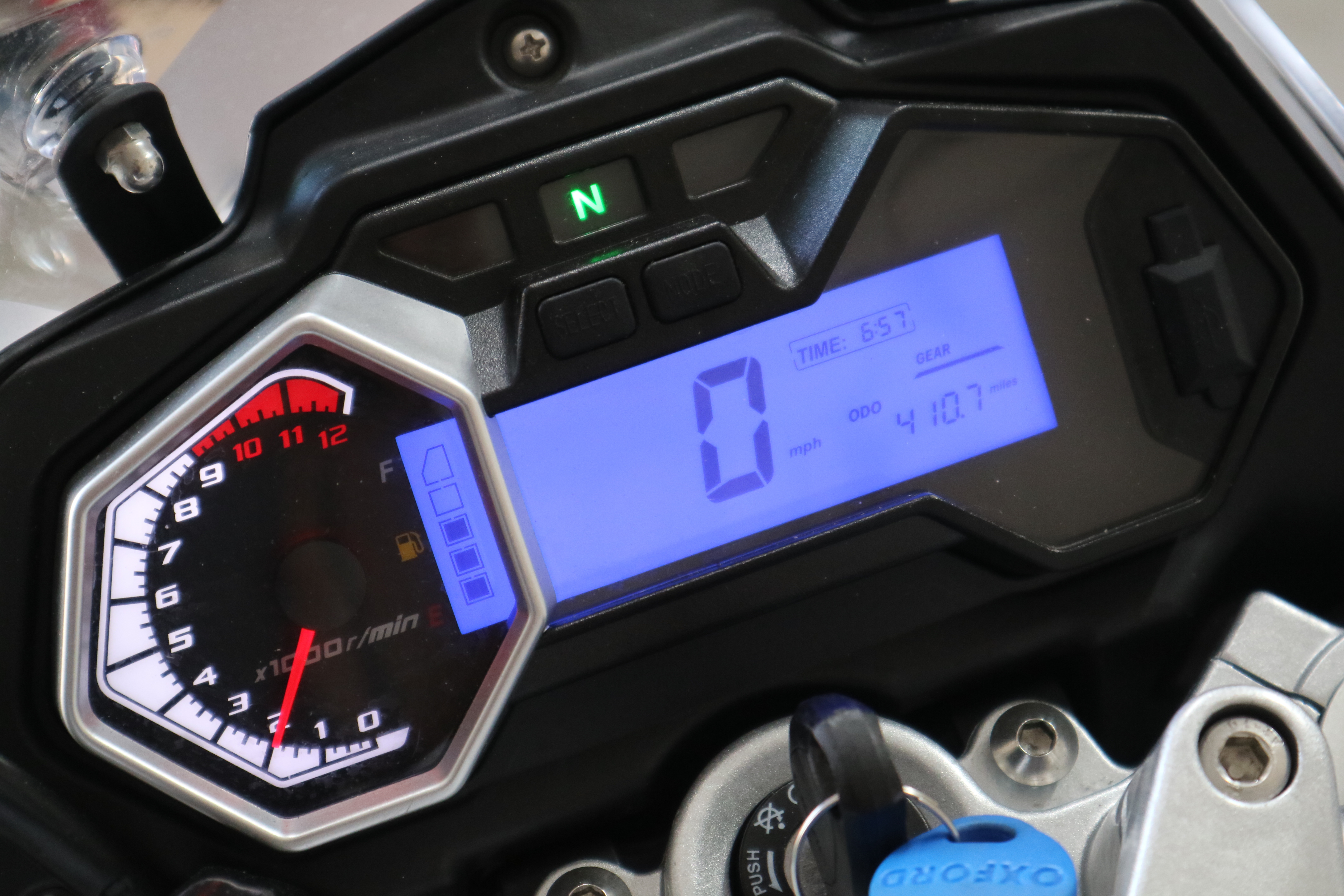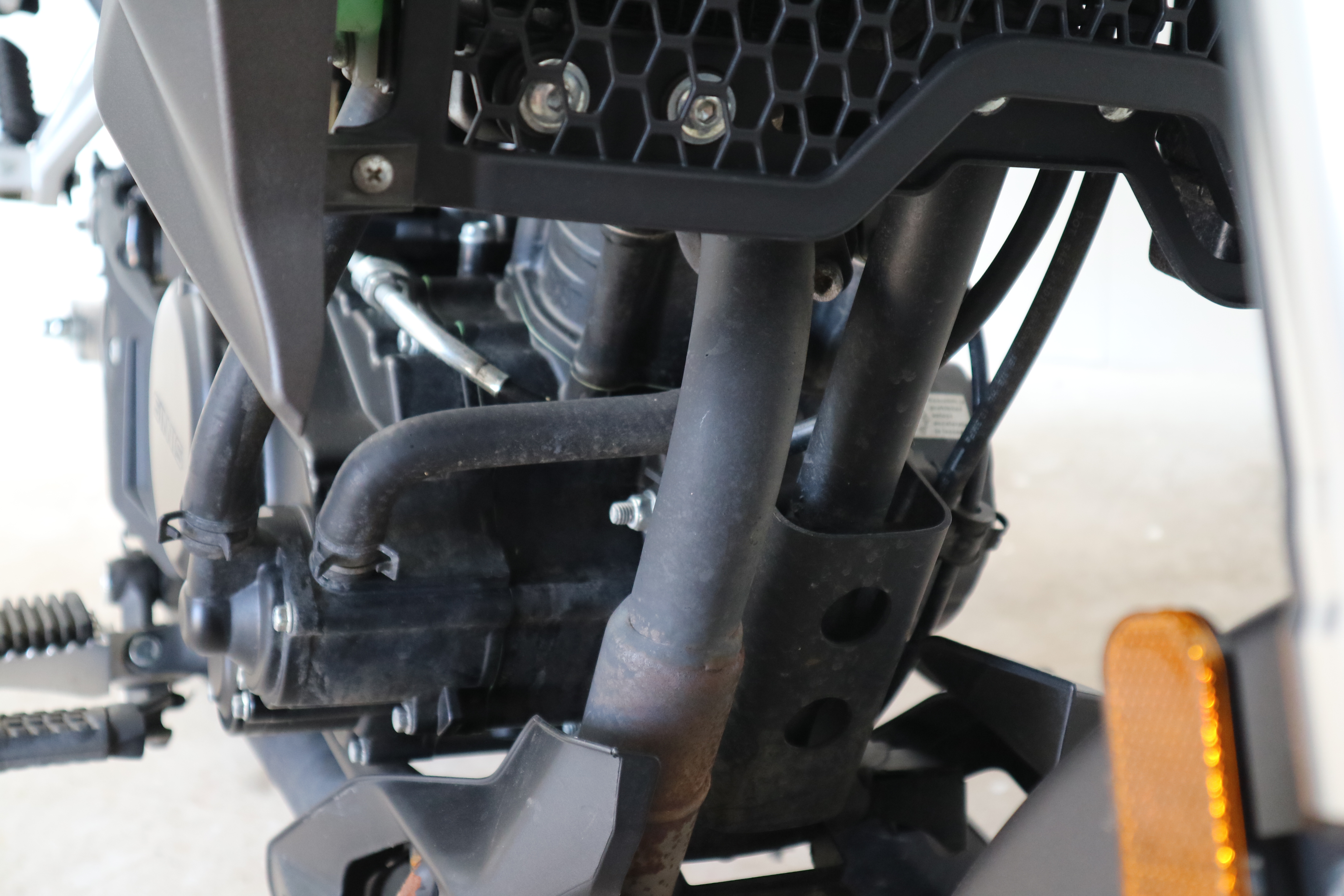With barely 800 miles on the clock. The RX125 isn’t even broken in. Both keys and manuals are included. There are a few scuffs here and there but on this type of bike – designed to be able to tackle the green lanes with ease – be worried if there wasn’t.